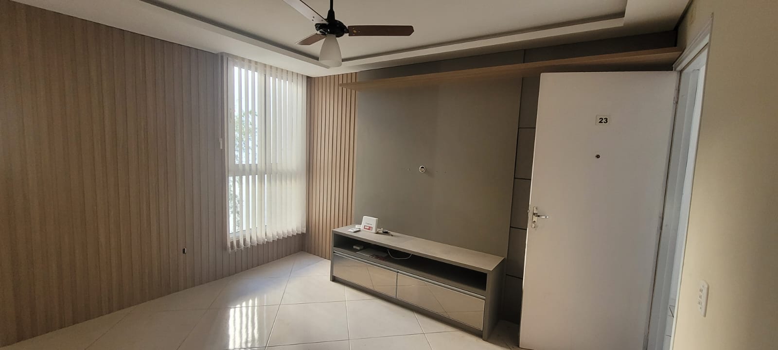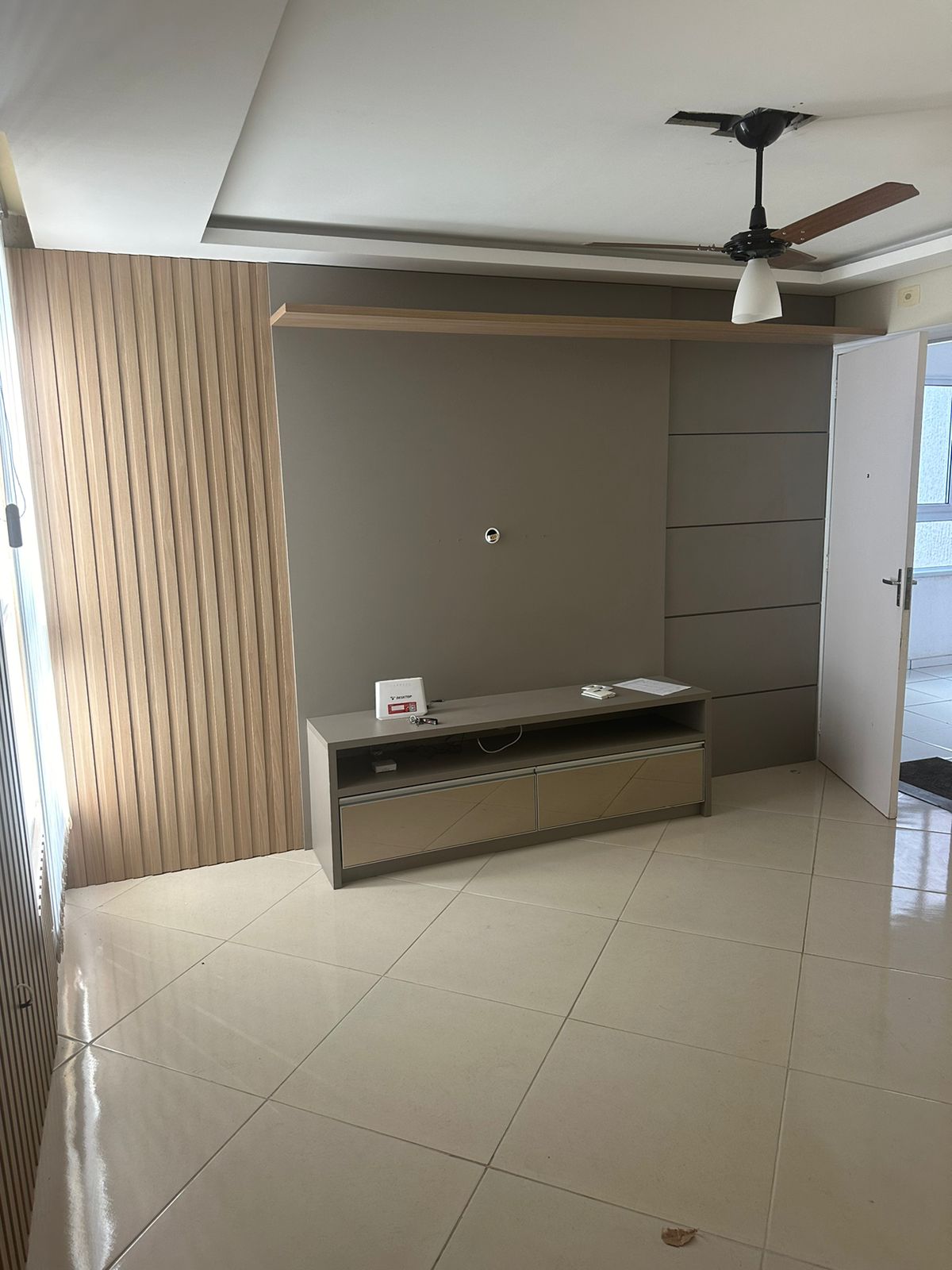 Sala: com painel ripado moderno e rack